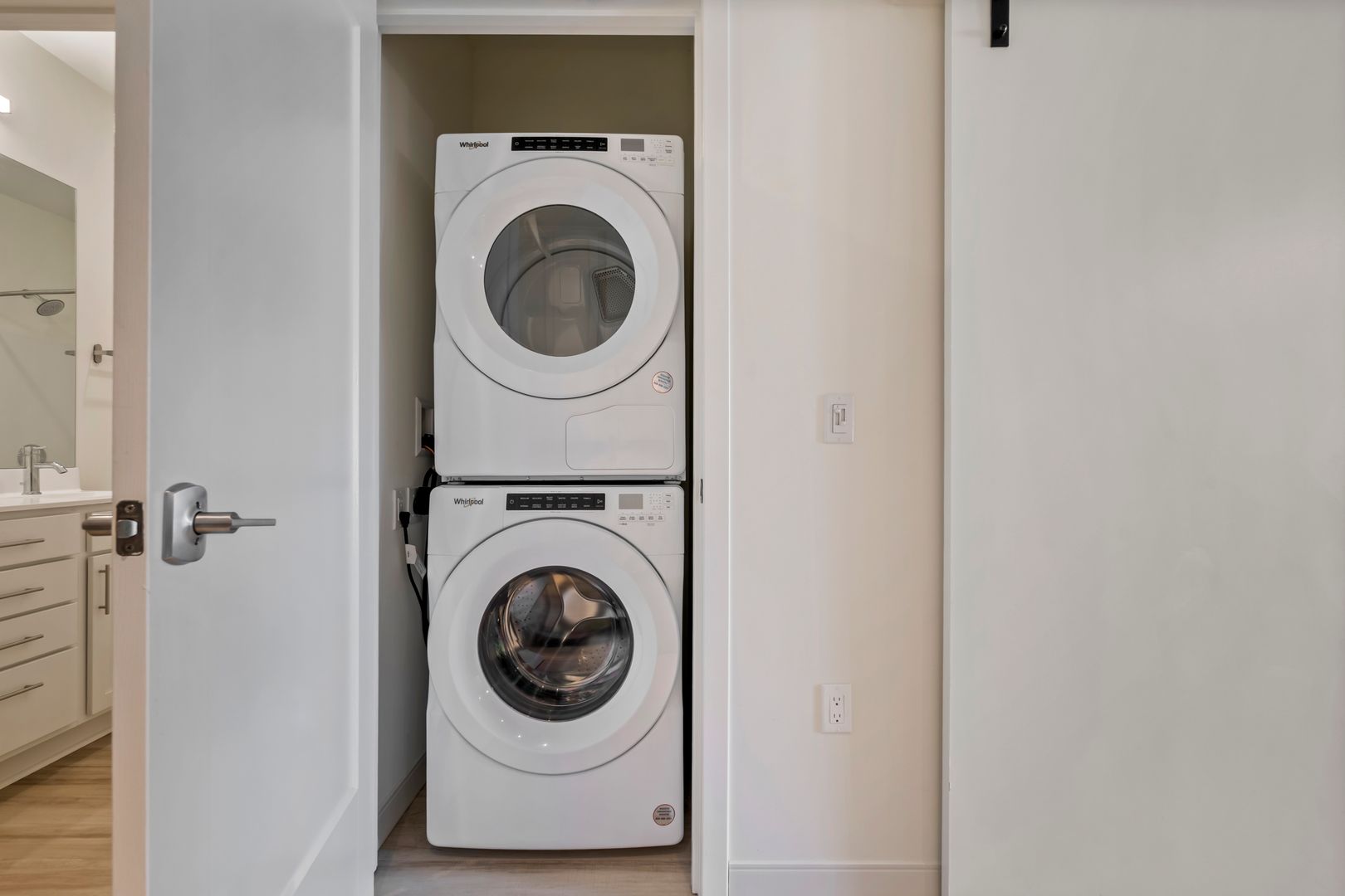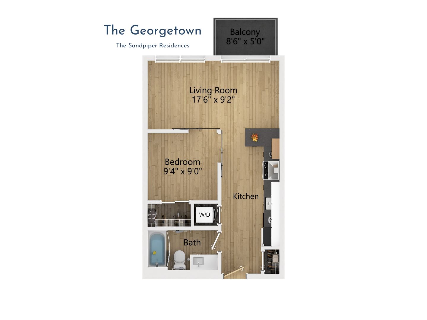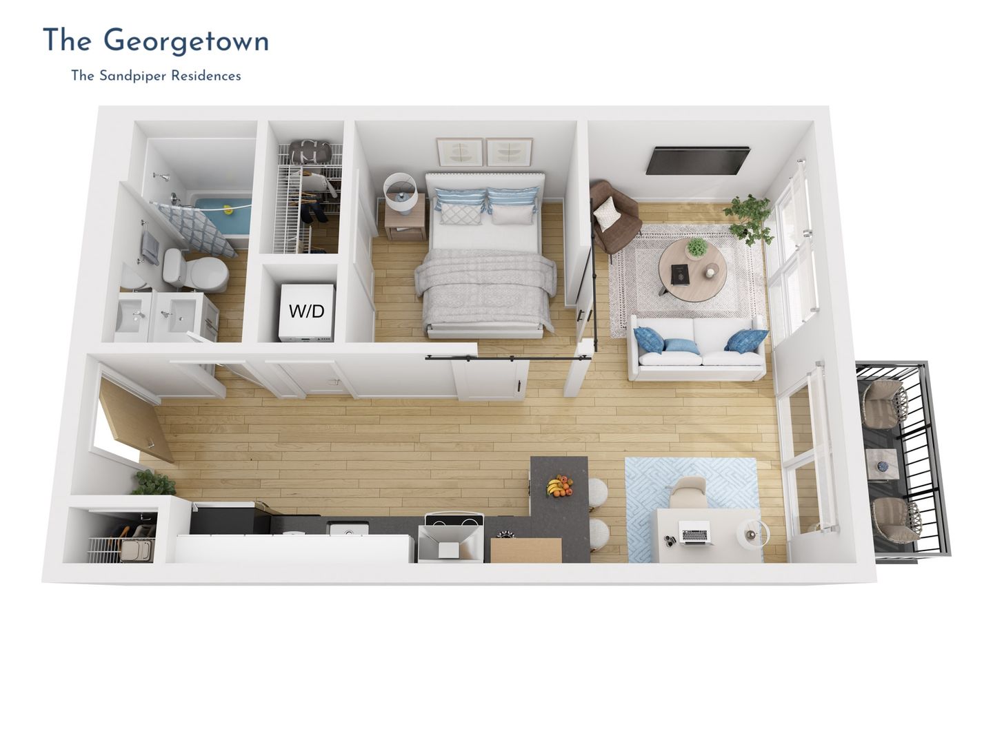 THE GEORGETOWN is a one bedroom, one bath apartment featuring floor-to-ceiling windows and doors, two closets, in-unit washer and dryer, and a private balcony. This sunny apartment offers white shaker-style cabinets, undermount soft close dovetail drawers, stainless steel Energy Star appliances, and a peninsula for counter-height seating overlooking the kitchen.