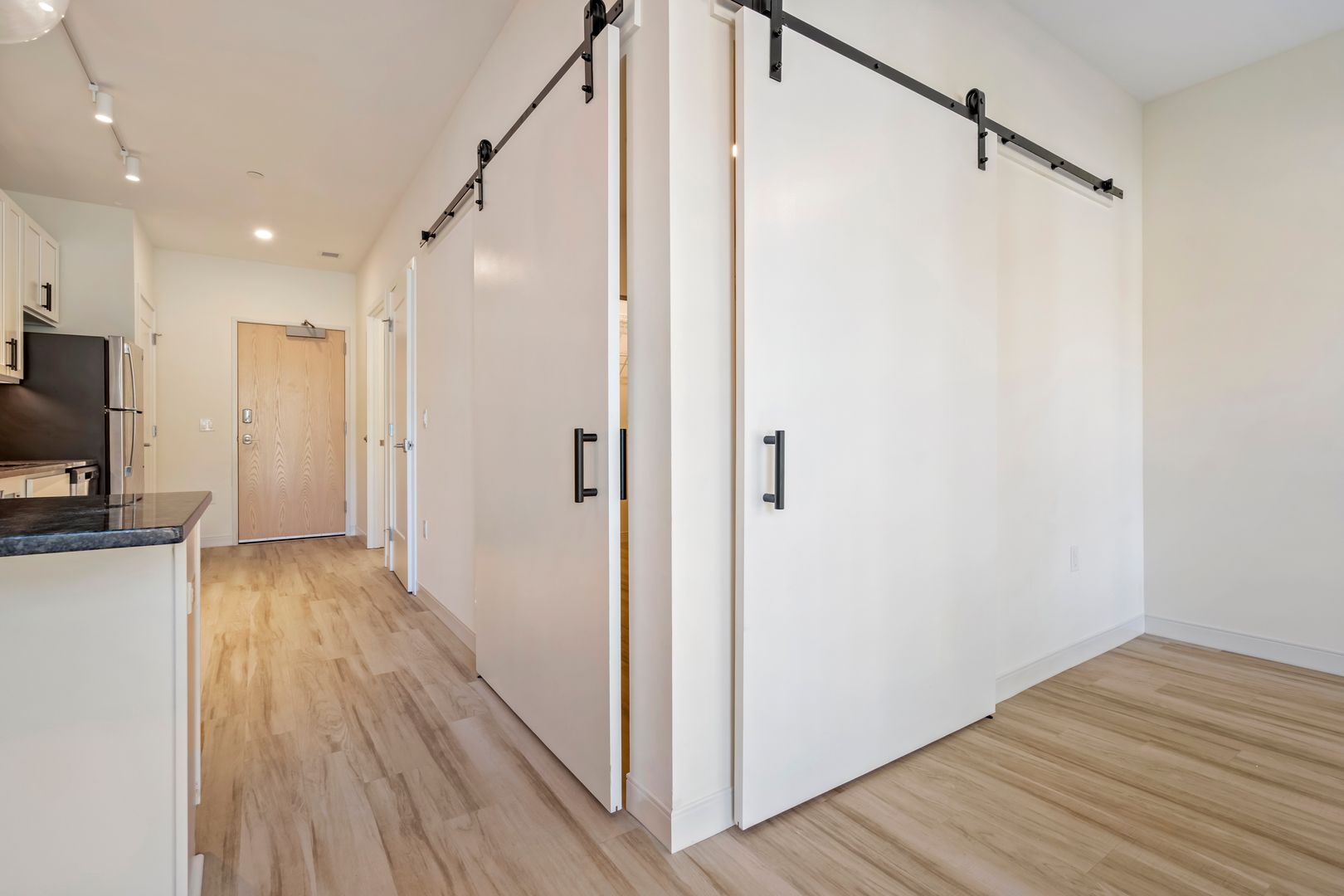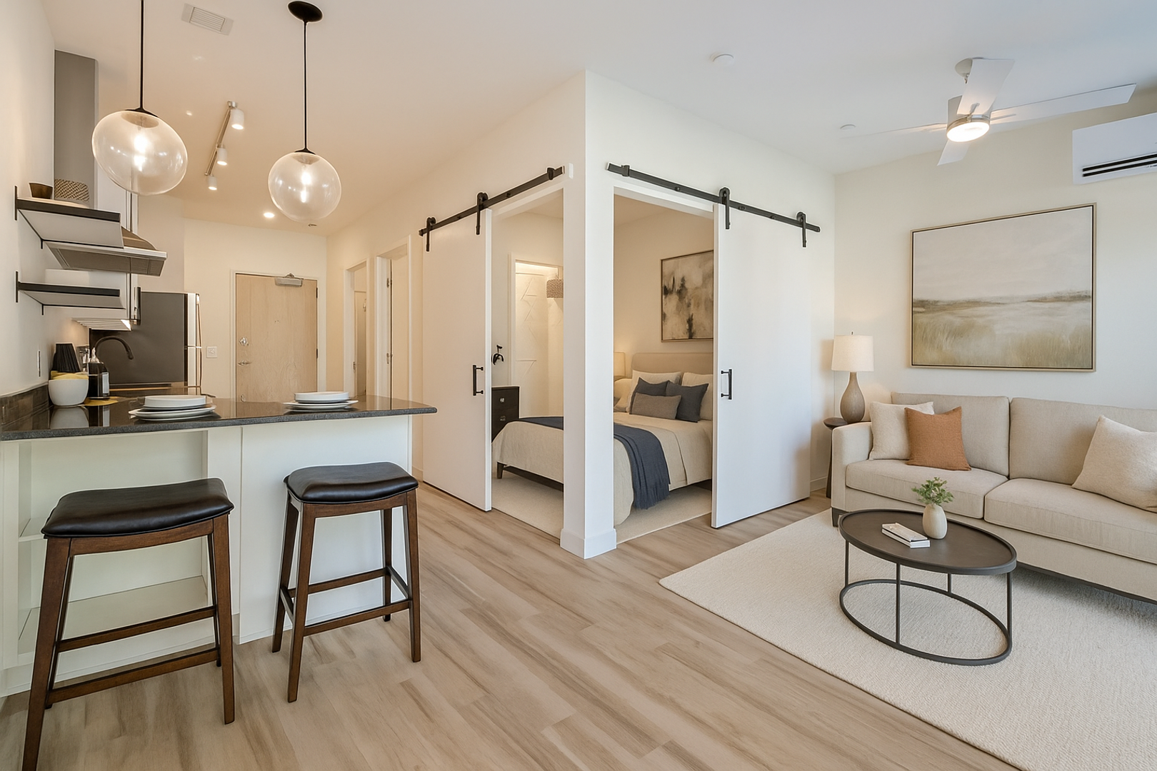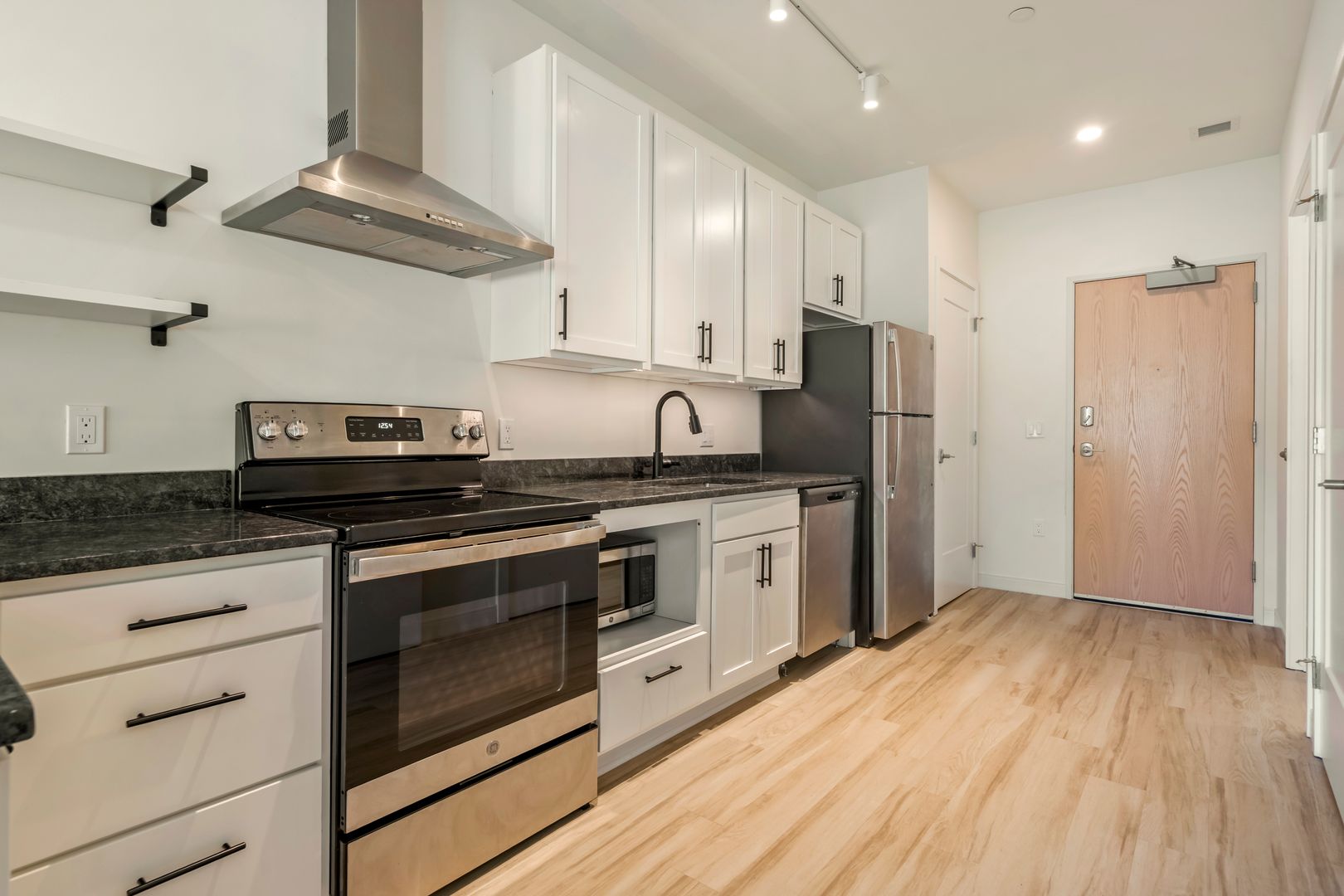 THE GEORGETOWN is a one bedroom, one bath apartment featuring floor-to-ceiling windows and doors, two closets, in-unit washer and dryer, and a private balcony. This sunny apartment offers white shaker-style cabinets, undermount soft close dovetail drawers, stainless steel Energy Star appliances, and a peninsula for counter-height seating overlooking the kitchen.